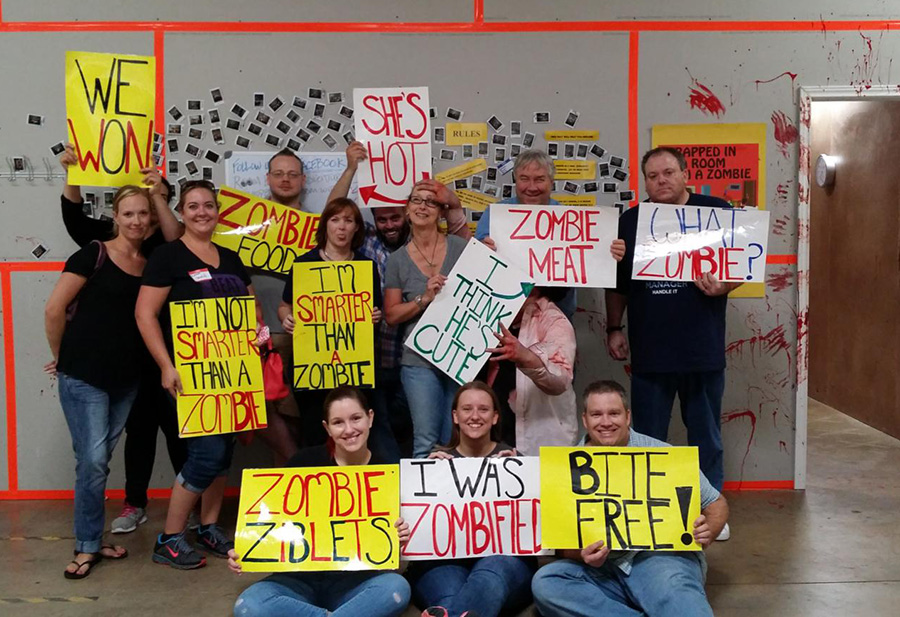 12 employees went to Room Escape Adventures’ Dallas location. They were locked in a room with a hungry “zombie” chained to the wall. To find the key to their freedom, the team had to work together to solve a series of brain teasers and riddles. The catch: they only had one hour to escape the clutches of the zombie. Every five minutes, the zombie’s chain was given some slack while the team raced through the “clues.”