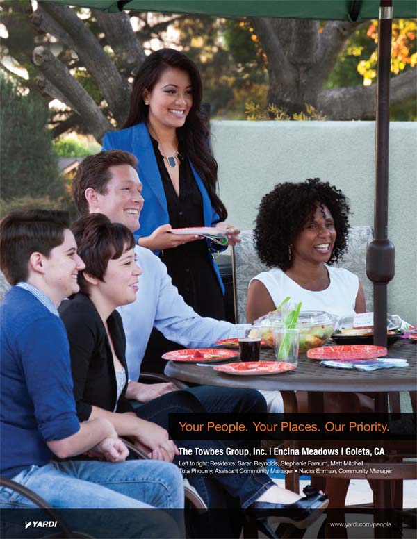 Ehrman, her front office team, and Encina Meadows residents participated in a photo shoot for a “Your People. Your Places. Our Priority” print ad. You can see the final product at right and an outtake from the shoot, taken in the Encina Meadows clubhouse, above.