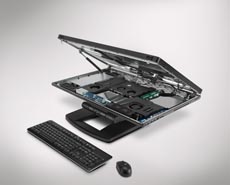 Upon a closer look, users discover that the monitor can be folded down, flush with the surface upon which it stands. The workstation can then be opened as one would open a laptop. Inside rests the hard drive, memory, and other vital components that can are easily disengaged; no tools are required.